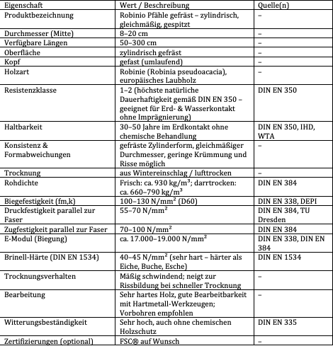 Robinienholz ist härter, elastischer und deutlich widerstandsfähiger gegen Feuchtigkeit und Schädlingsbefall als Eiche oder Edelkastanie. Mit einer Rohdichte von 930 kg/m³ (frisch) übertrifft es die meisten heimischen Hölzer in Festigkeit und Dauerhaftigkeit.